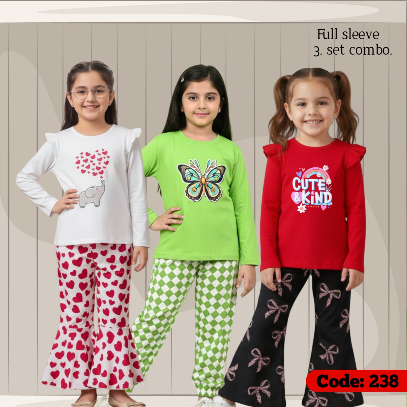 [3] full sleeve T-shirt pant combo sets in three designs,