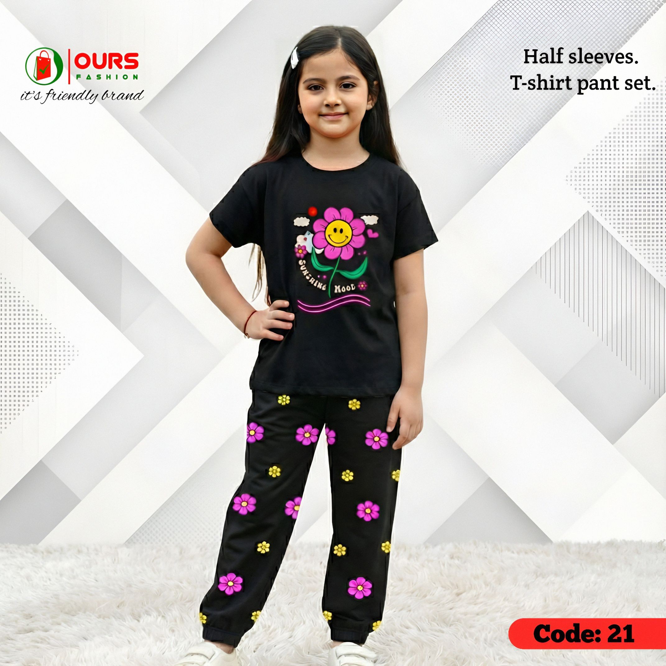 Flower design half sleeve t-shirt + pant set.