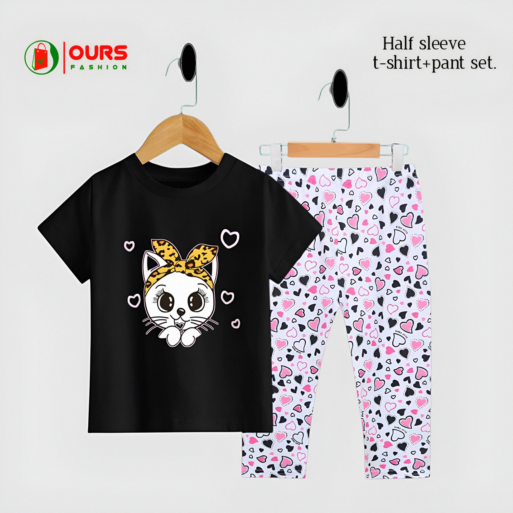 Cat design half sleeve t-shirt + pant set.