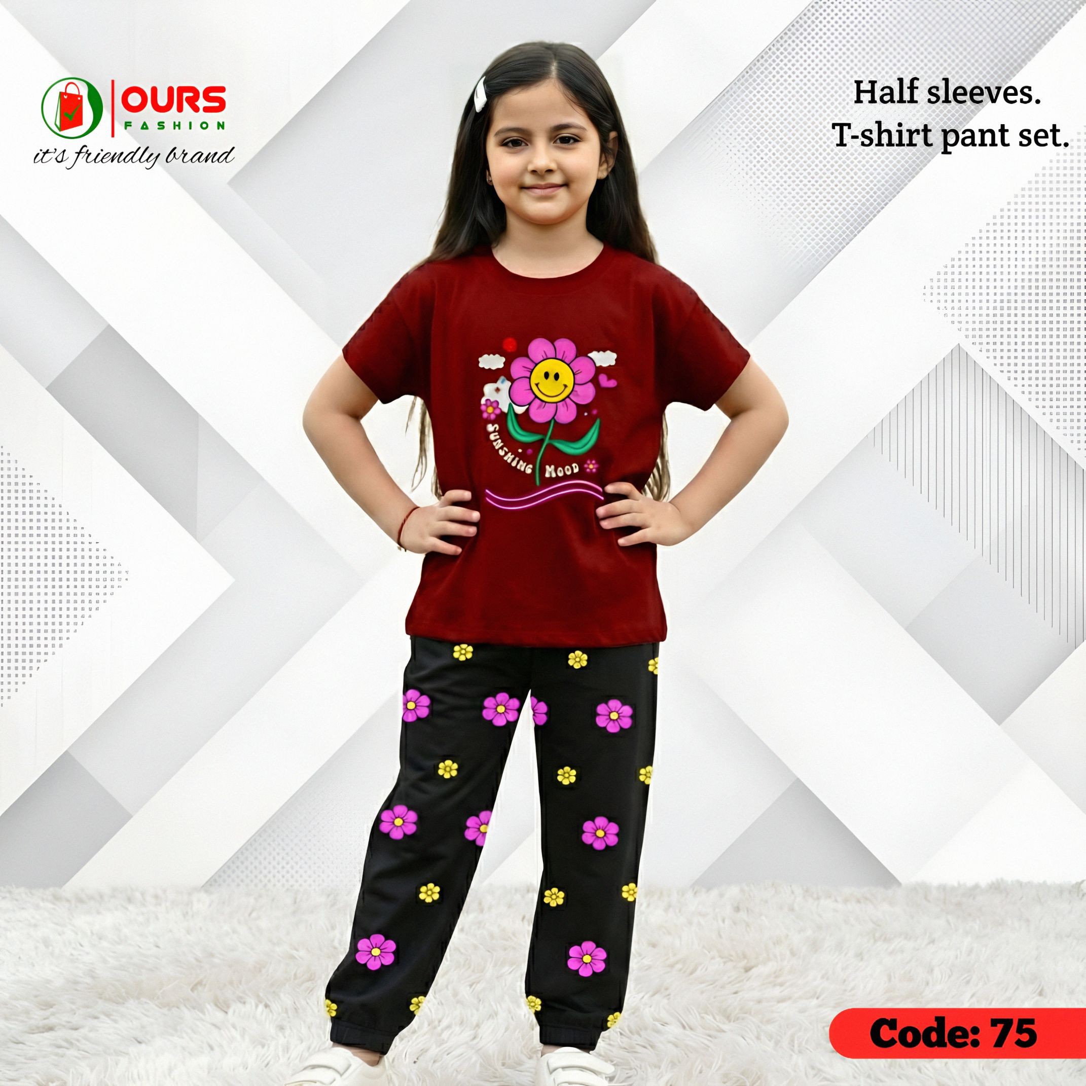 Flower design half sleeve t-shirt + pant set.