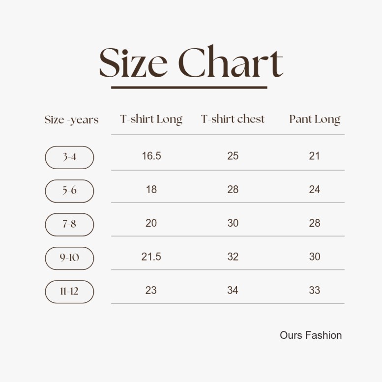 11-12 = t shirt Long ( 23-inc ) t-shirt Chest ( 34-inc ) pant Long ( 33-inc )